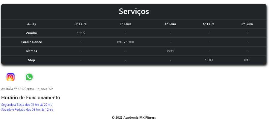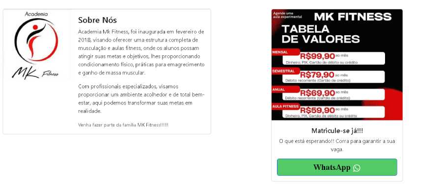 Desenvolvimento de um site com uma página para apresentação da Academia MK Fitness, incluindo informações sobre a empresa, seus serviços, planos e formas de contato.